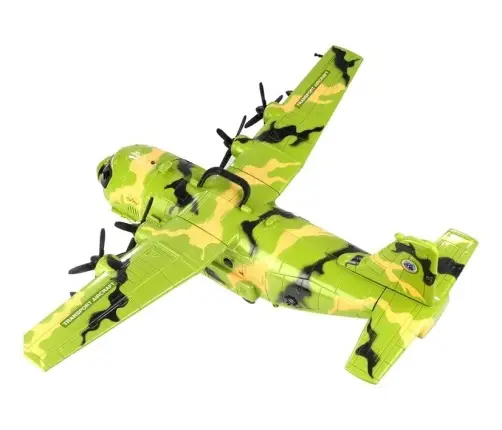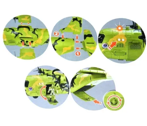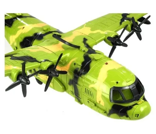 The set from the military series has been made of certified, robust plastic material. The colours of the plane, decorated with moro patterns, perfectly refer to military colours, which makes the toy look very real. The plane is very large, with a wingspan of 64 cm and a length of 55 cm. The construction of the plane includes movable and opening elements. The propellers on the wings of the aircraft are rotatable, as are the triple guns protruding from the windows of the machine. The doors at the front and rear of the aircraft open, allowing the figures to be placed inside the toy. On the side of the aircraft there are two buttons which, when pressed, trigger light and sound effects, making play even more fun!