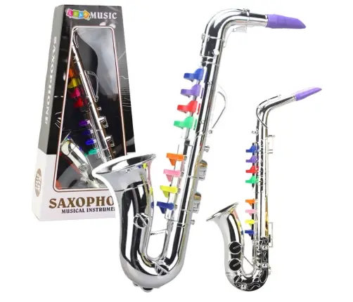 This toy saxophone is a unique musical instrument for children that introduces little ones to the fascinating world of music. Crafted in silver with colorful keys, it attracts attention and encourages play. Thanks to its simple operation, it requires no batteries, making it eco-friendly, safe, and always ready to use.